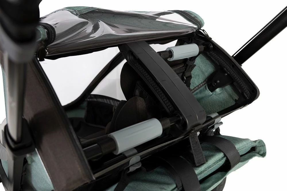- Integriertes Regenverdeck: Das Regencover befindet sich in einer integrierten Tasche mit Reißverschluss und lässt sich schnell über den Anhänger stülpen.